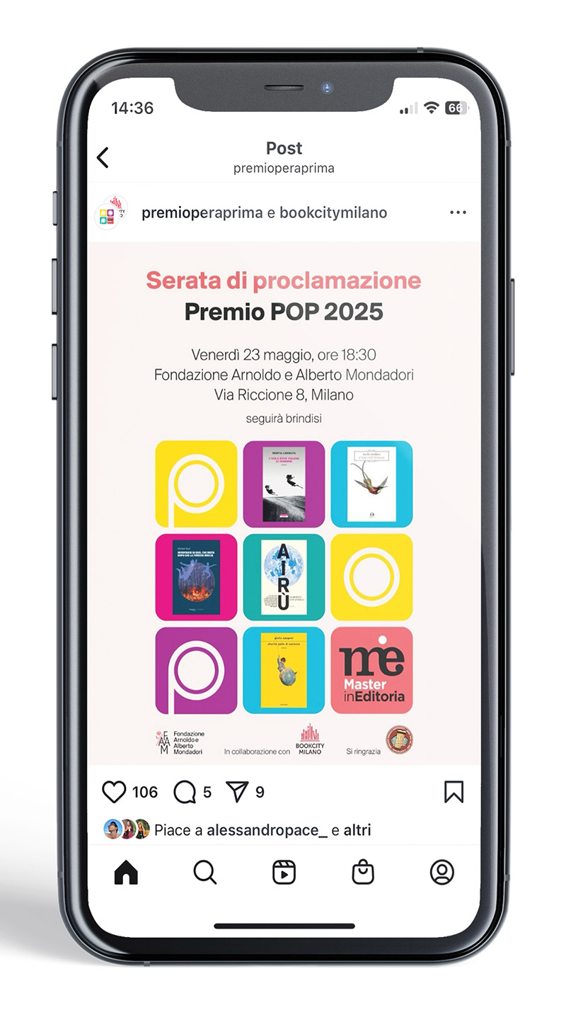 Logo redesign for Premio POP – Premio Opera Prima, an award for emerging Italian fiction authors, created with the participation of students from the Master in Editoria, promoted by Università degli Studi di Milano, Associazione Italiana Editori, and Fondazione Arnoldo e Alberto Mondadori.